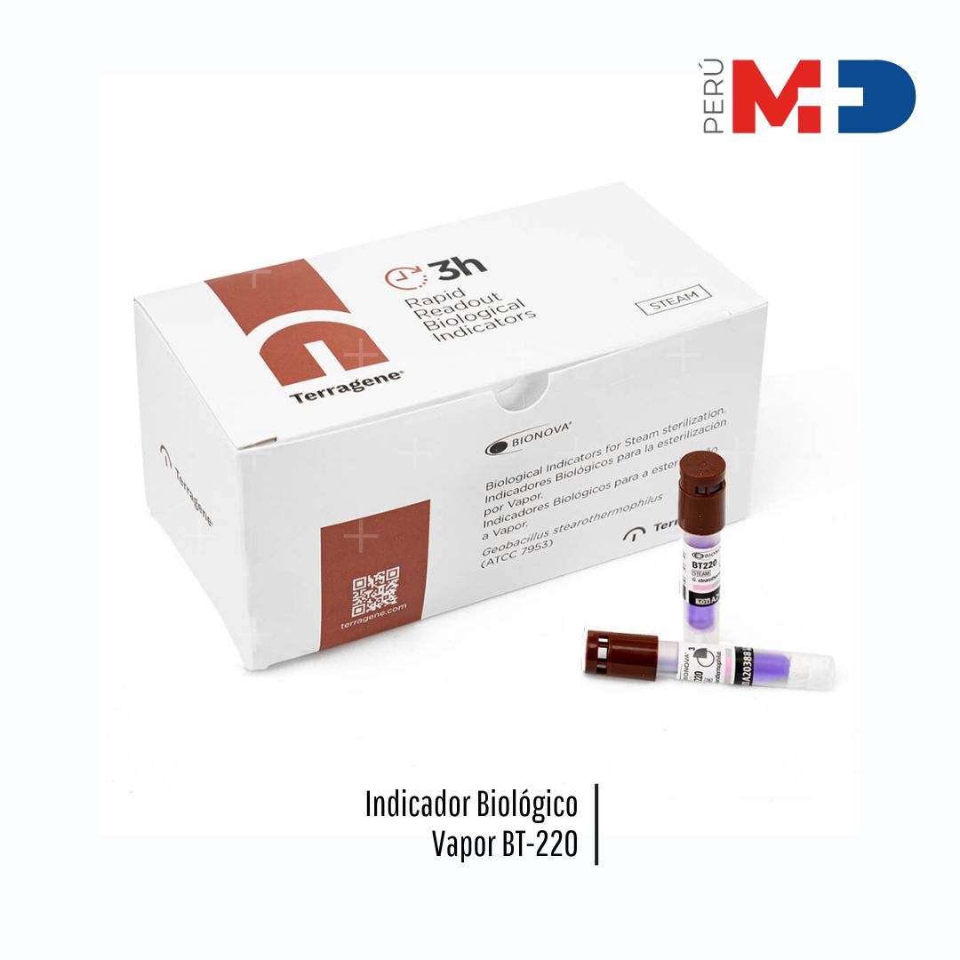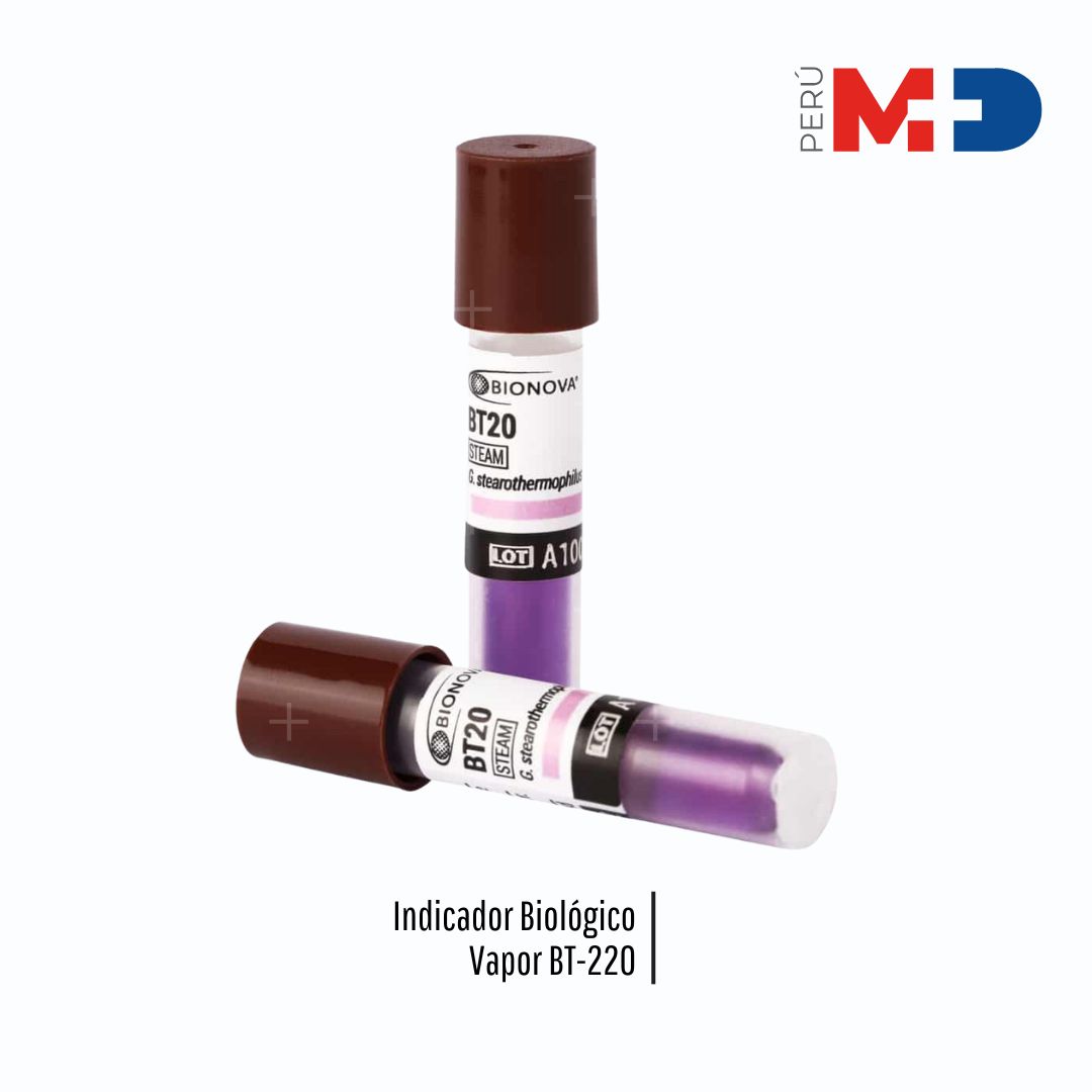 El Indicador Biológico Vapor BT-220 de BIONOVA es un dispositivo autocontenido diseñado para el control de procesos de esterilización por vapor, ya sea asistido por vacío o por desplazamiento de aire por gravedad, a temperaturas entre 121 y 135 °C. Utiliza esporas de Geobacillus stearothermophilus para verificar la eficacia del proceso, con un tiempo de lectura rápida de aproximadamente 3 horas mediante un sistema de fluorescencia, lo que facilita un control rápido y confiable de la esterilización. Sus dimensiones son aproximadamente 50,7 mm de alto por 8,5 mm de diámetro externo.